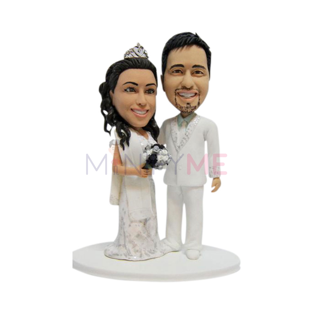 Commemorate your beautiful Asian-style wedding with this Asian Wedding 3 cake topper. In this figure, both the bride and the groom are standing in their traditional white attire atop a matching white platform. Both people are made to look like whatever photo you send into us.