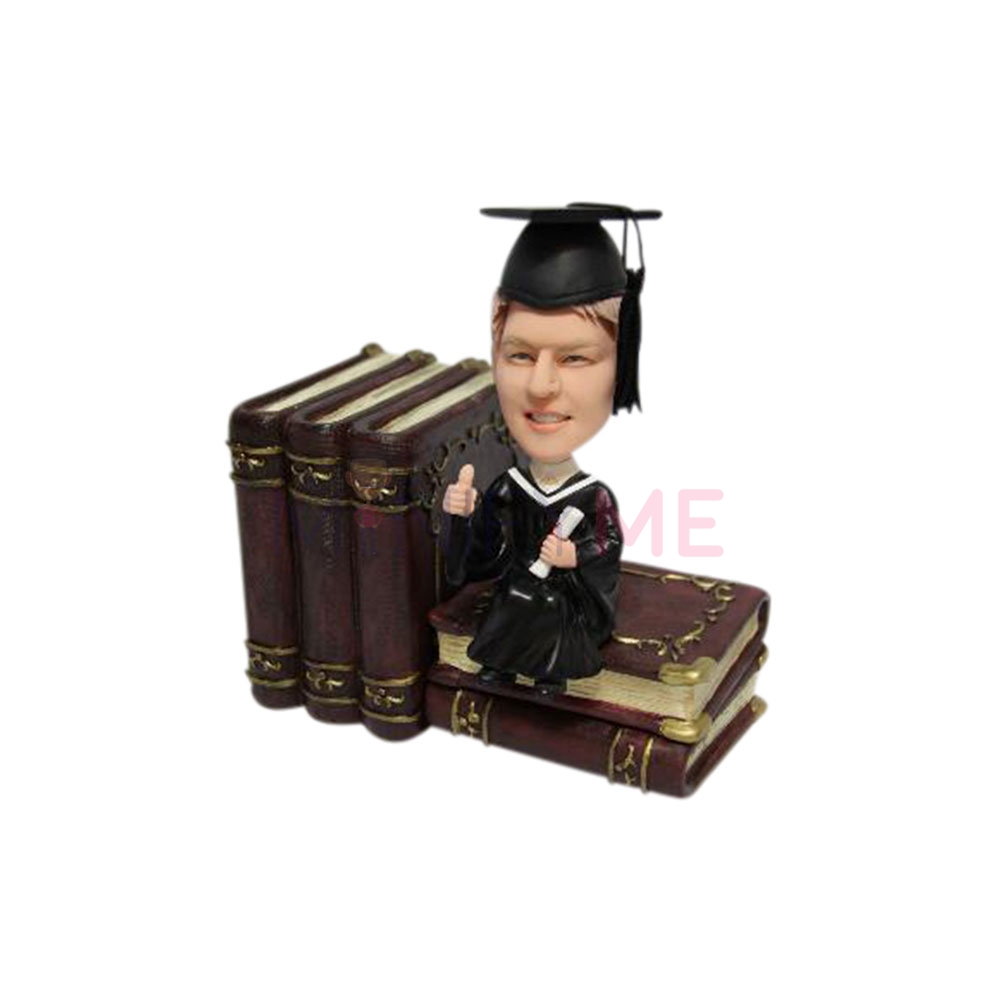 Your graduate deserves recognition for their hard work, and with the Graduate Male 2, you can celebrate them in an individualised manner. This figure features the likeness of the recent graduate as he sits on a stack of books. He holds a diploma and wears a cap and gown.