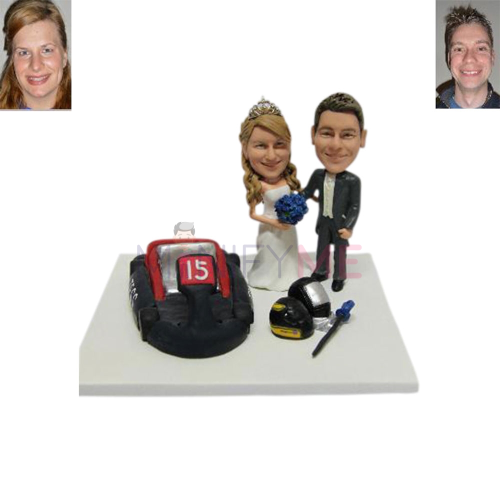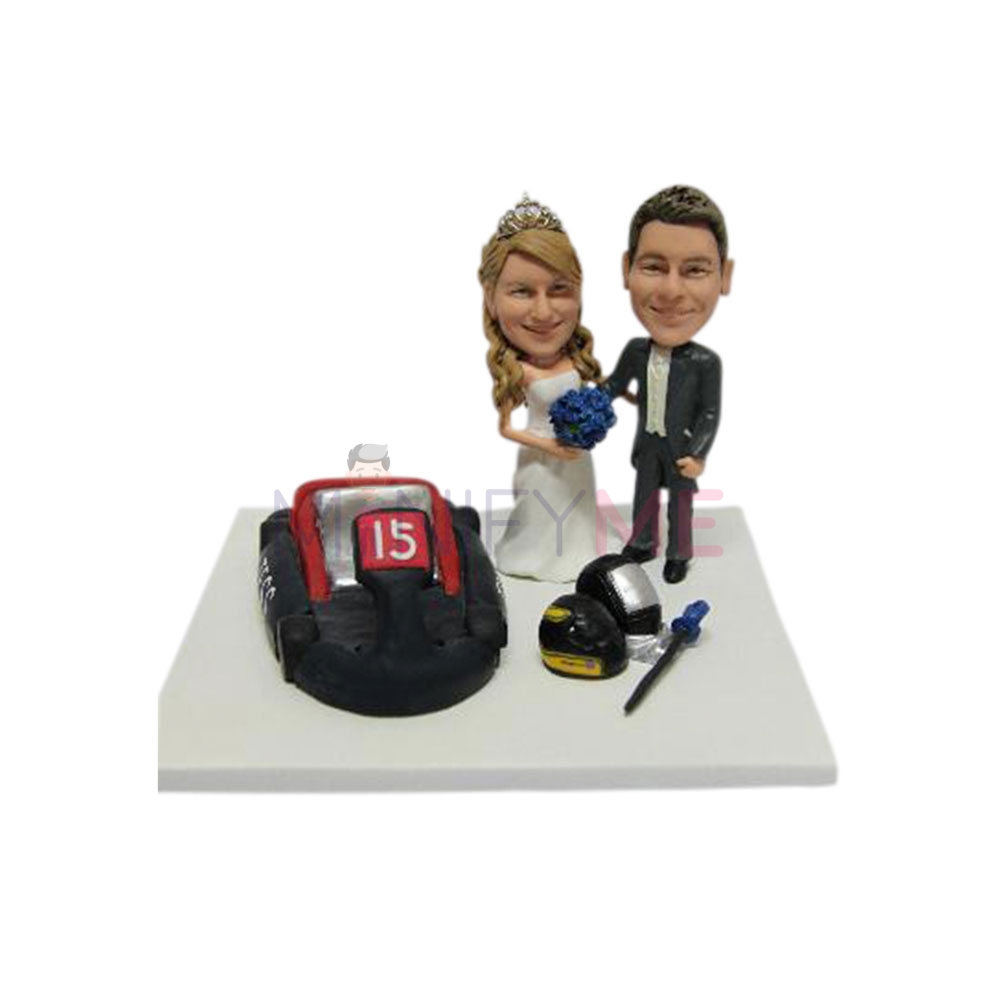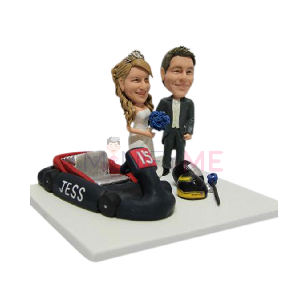 Your love for adventure and play hasn’t died out with age, and you can show your shared love of fun with this Go Kart wedding cake topper. The figurine features both the bride and groom standing on a white platform beside the go-kart and go-kart gear.